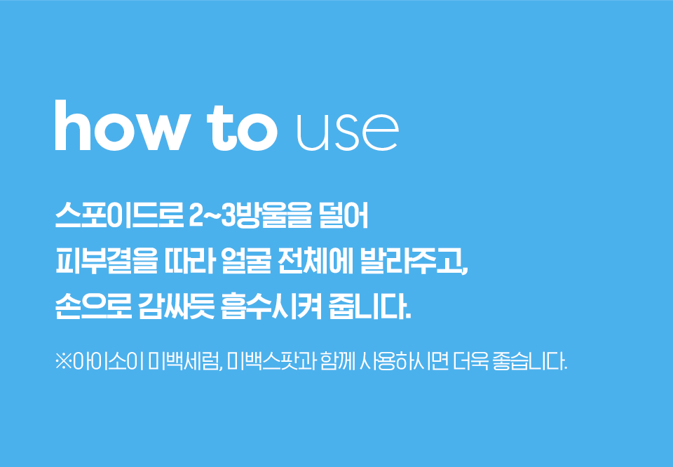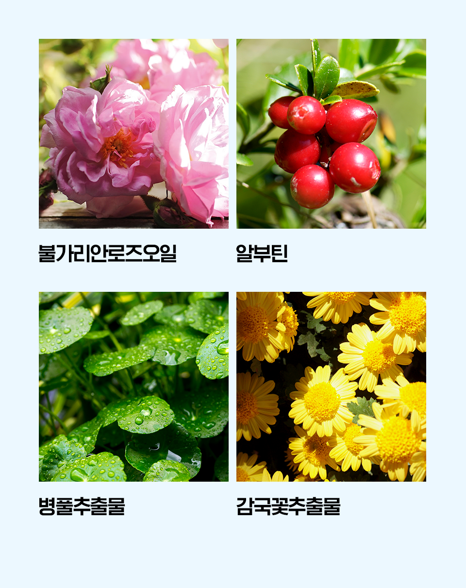 정제수, 글리세린, 에탄올, 베타인, 알부틴, 잔탄검, 알란토인, 판테놀, 다마스크장미꽃수, 아사이팜열매추출물, 로우스위트블루베리추출물, 인디안구스베리열매추출물, 크랜베리추출물, 붉나무충영추출물, 올리브나무잎추출물, 감국꽃추출물, 회화나무싹추출물, 꿀풀잎추출물, 밤껍질추출물, 흰버드나무껍질추출물, 병풀추출물, 황금추출물, 모란뿌리추출물, 스페인감초뿌리추출물, 비타민나무열매오일, 다마스크장미꽃오일, 창포뿌리추출물, 검정콩추출물, 검은깨추출물, 녹차추출물, 다시마추출물, 부틸렌글라이콜, 1,2-헥산다이올, 포트마리골드꽃추출물, 로즈마리추출물, 니아울리나무잎오일, 마트리카리아꽃/잎추출물, 시트로넬올, 제라니올 *아이소이에서 사용하는 에탄올은 식물발효성분입니다.