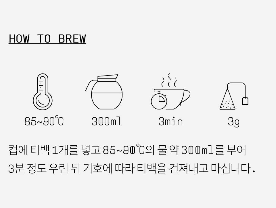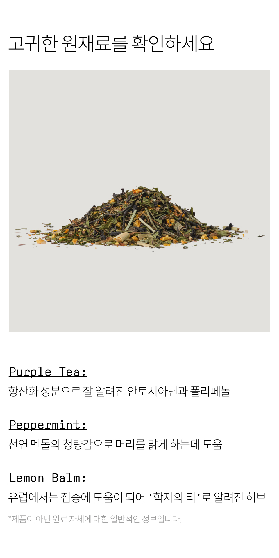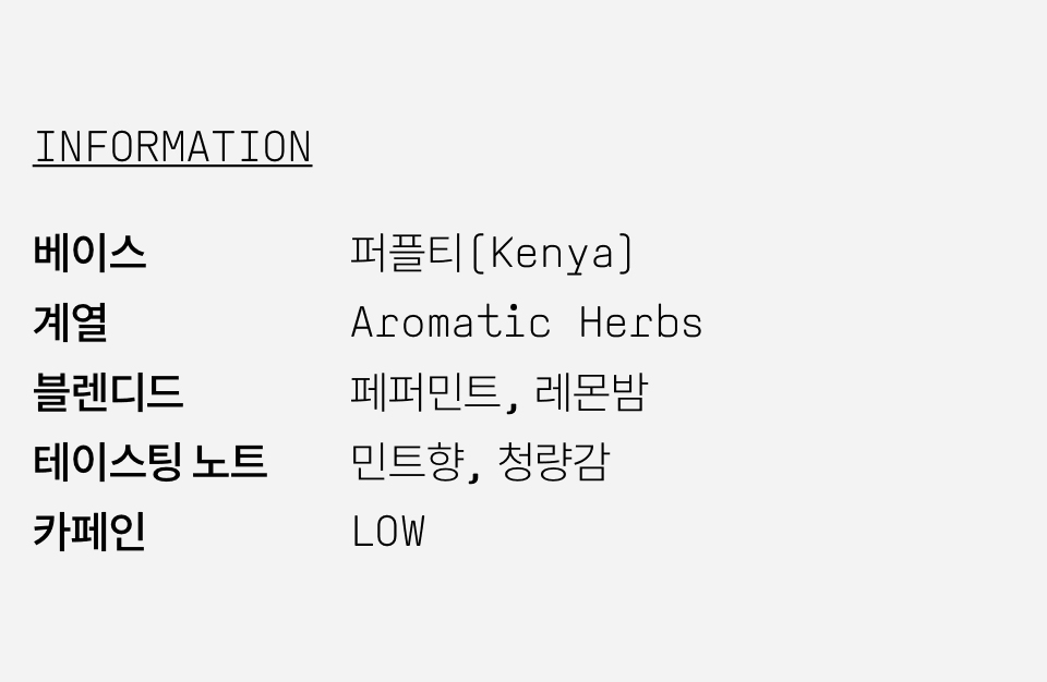 페퍼민트(미국산), 사탕수수원당(모리셔스산), 퍼플티(홍차-케냐산), 귤피(국내산), 레몬그라스(이집트산), 레몬밤(불가리아산)