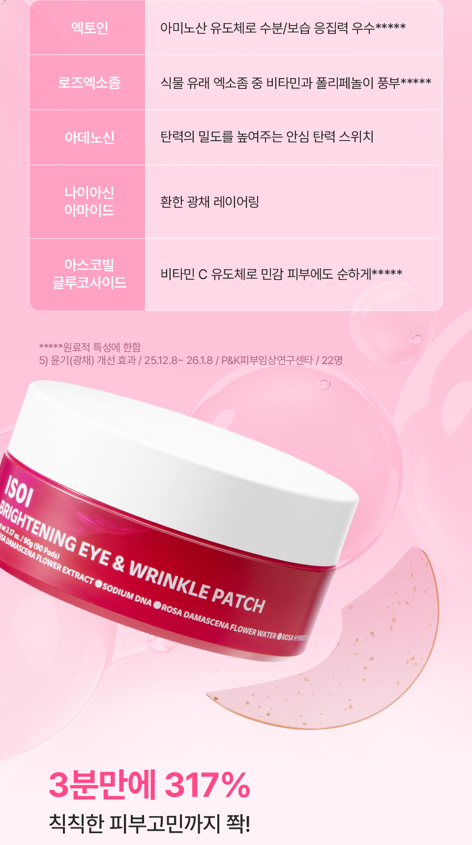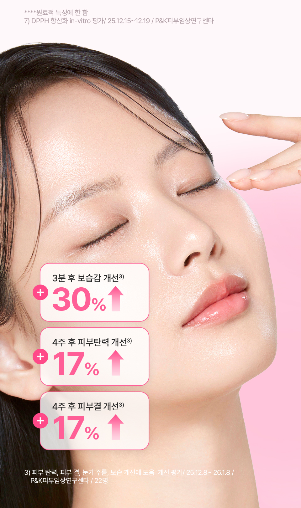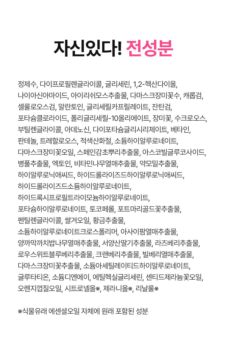정제수, 다이프로필렌글라이콜, 글리세린, 1,2-헥산다이올, 나이아신아마이드, 아이리쉬모스추출물, 다마스크장미꽃수, 캐롭검, 셀룰로오스검, 알란토인, 글리세릴카프릴레이트, 잔탄검, 포타슘클로라이드, 폴리글리세릴-10올리에이트, 장미꽃, 수크로오스, 부틸렌글라이콜, 아데노신, 다이포타슘글리시리제이트, 베타인, 판테놀, 트레할로오스, 적색산화철, 소듐하이알루로네이트, 다마스크장미꽃오일, 스페인감초뿌리추출물, 아스코빌글루코사이드, 병풀추출물, 엑토인, 비타민나무열매추출물, 약모밀추출물, 하이알루로닉애씨드, 하이드롤라이즈드하이알루로닉애씨드, 하이드롤라이즈드소듐하이알루로네이트, 하이드록시프로필트라이모늄하이알루로네이트, 포타슘하이알루로네이트, 토코페롤, 포트마리골드꽃추출물, 펜틸렌글라이콜, 쌀겨오일, 황금추출물, 소듐하이알루로네이트크로스폴리머, 아사이팜열매추출물, 양까막까치밥나무열매추출물, 서양산딸기추출물, 라즈베리추출물, 로우스위트블루베리추출물, 크랜베리추출물, 빌베리열매추출물, 다마스크장미꽃추출물, 소듐아세틸레이티드하이알루로네이트, 글루타티온, 소듐디엔에이, 에틸헥실글리세린, 센티드제라늄꽃오일, 오렌지껍질오일, 시트로넬올※, 제라니올※, 리날룰※ ※자연유래 에센셜오일 자체에 원래 포함된 성분