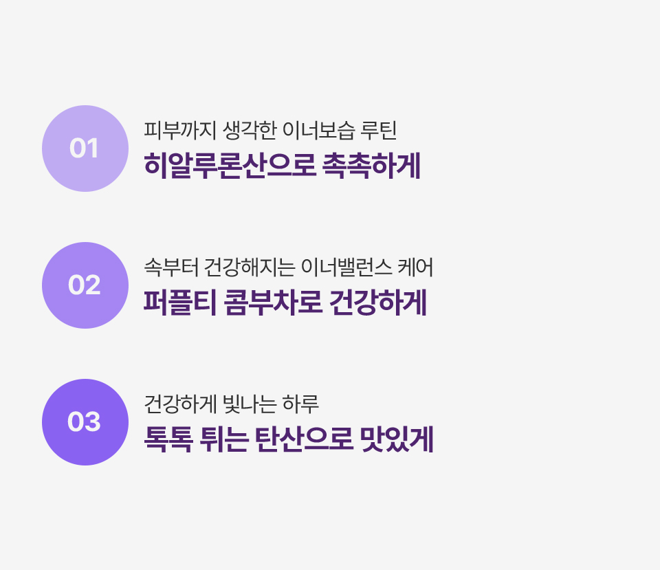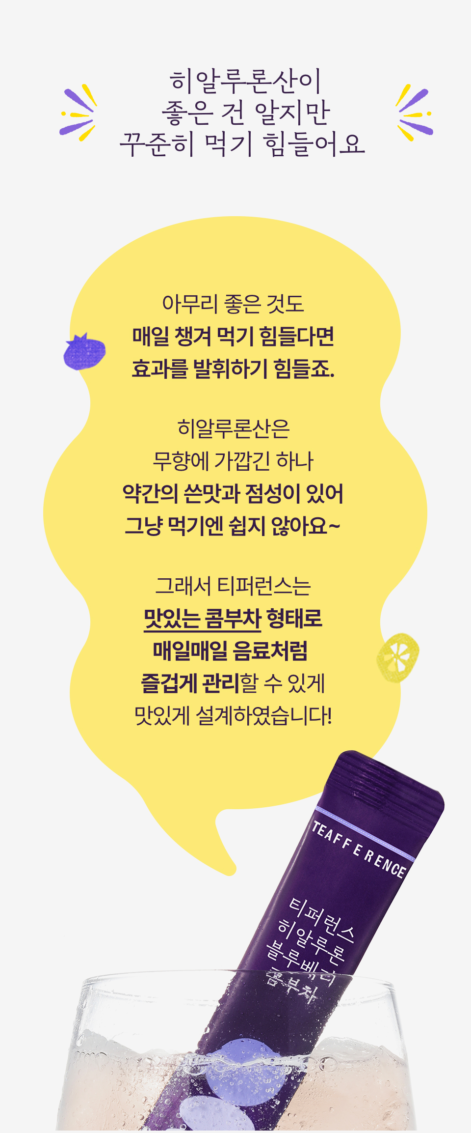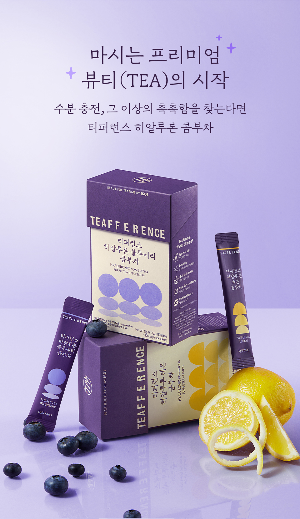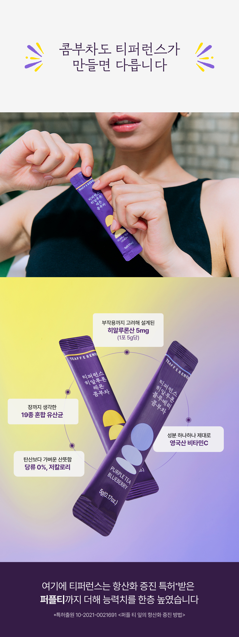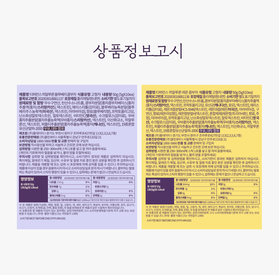 [히알루론 블루베리 콤부차] 무수구연산, 탄산수소나트륨, 콤부차분말[홍차콤부차베이스{홍차추출액(홍차/스리랑카산)}, 덱스트린], 에리스리톨(감미료), 블루베리농축분말{블루베리주스농축액(미국산), 덱스트린, 아라비아검}, 향료(블루베리향), 프락토올리고당, 난소화성말토덱스트린, 말토덱스트린, 비타민C(영국산), 수크랄로스(감미료), 우바홍차추출분말[홍차추출농축액(우바홍차/스리랑카산), 덱스트린], 이산화규소, 히알루론산, 덱스트린, 퍼플티추출분말[홍차추출농축액{홍차(케냐산)}, 덱스트린], 19종혼합유산균알파-2000 [우유, 대두 함유]<br> [히알루론 레몬 콤부차] 무수구연산, 탄산수소나트륨, 콤부차분말[홍차콤부차베이스{홍차추출액(홍차/스리랑카산), 덱스트린, 프락토올리고당, 유산균(캐나다산), 효모}, 덱스트린], 에리스리톨(감미료), 레몬과즙분말HCS-5946[덱스트린, 레몬과즙(레몬/미국산), 아라비아검, 구연산, 향료(레몬라임향)], 레몬향분말H[덱스트린, 혼합제제{레몬향/트리아세틴, 향료, 주정}, 아라비아검], 프락토올리고당, 난소화성말토덱스트린, 말토덱스트린, 비타민C(영국산), 수크랄로스(감미료), 우바홍차추출분말[홍차추출농축액(우바홍차/스리랑카산), 덱스트린], 퍼플티추출분말[홍차추출농축액{홍차(케냐산)}, 덱스트린], 이산화규소, 히알루론산, 덱스트린, 19종혼합유산균알파-2000 [우유, 대두 함유]